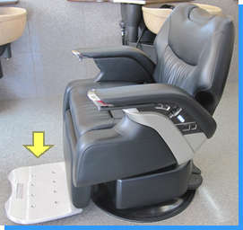 ■車椅子でご来店のお客様に優しい理容いす■ 車椅子から理容いすへの移動がスムーズになるように、足元の板(写真左下矢印)を取り外します。